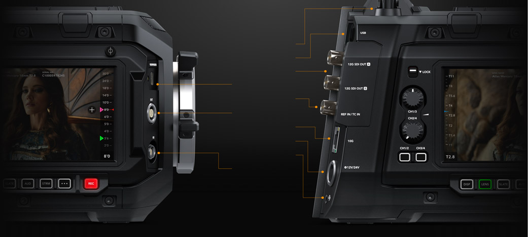 Một loạt các kết nối tiêu chuẩn công nghiệp trên URSA Cine khiến nó trở nên hoàn hảo cho việc sản xuất phim chất lượng cao. Đầu nối Lemo 7 chân và đầu nối Fischer 3 chân ở phía trước cung cấp khả năng khởi động/dừng kỷ lục và nguồn điện 24V nên rất lý tưởng cho các phụ kiện trên bo mạch như động cơ lấy nét. Nguồn máy ảnh được cung cấp bởi kết nối Lemo 24V 8 pin tiêu chuẩn, ngoài ra còn có thêm một kết nối Lemo 12V 2 pin ở phía sau dành cho các phụ kiện điện áp thấp hơn. Tất cả điều này có nghĩa là bạn có thể cấp nguồn cho các phụ kiện trực tiếp từ máy ảnh mà không cần phải đi dây cáp bên ngoài lộn xộn! Ngoài ra còn có hai đầu ra 12G-SDI độc lập để giám sát trên 2 màn hình khác nhau với các lớp phủ khác nhau, cùng với 10G Ethernet để đồng bộ hóa phương tiện Blackmagic Cloud!