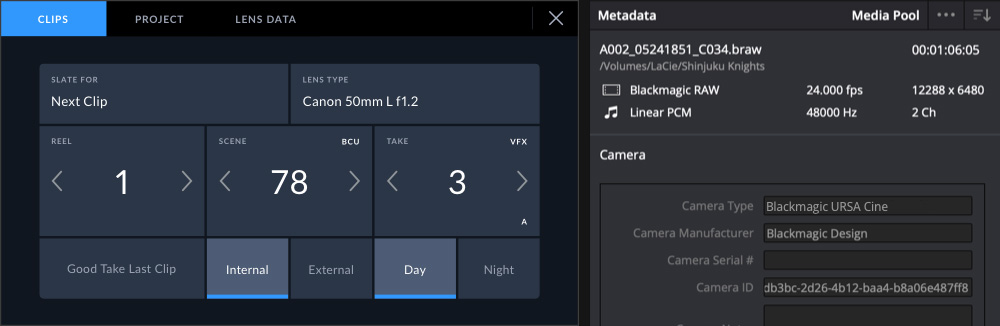 URSA Cine có tính năng phương tiện kỹ thuật số để bạn có thể nhanh chóng thêm siêu dữ liệu vào bất kỳ cảnh quay nào! Chỉ cần vuốt sang trái hoặc phải trên màn hình cảm ứng tích hợp để hiển thị bảng kỹ thuật số. Nếu bạn bắt đầu và dừng ghi, phương tiện chặn có thể tự động tăng số lần chụp để bạn không phải nhập chúng theo cách thủ công cho mỗi lần chụp! Bạn cũng có thể đặt số cuộn của mình tự động tăng lên mỗi khi bạn định dạng thẻ. Siêu dữ liệu ống kính được điền tự động hoặc có thể được nhập thủ công, cùng với thông tin cụ thể về sản xuất, thông tin kỹ thuật, v.v.! Tất cả siêu dữ liệu được lưu cùng với các tệp để sử dụng trong quá trình hậu kỳ khi chỉnh sửa và chỉnh màu bằng phần mềm như DaVinci Resolve!
